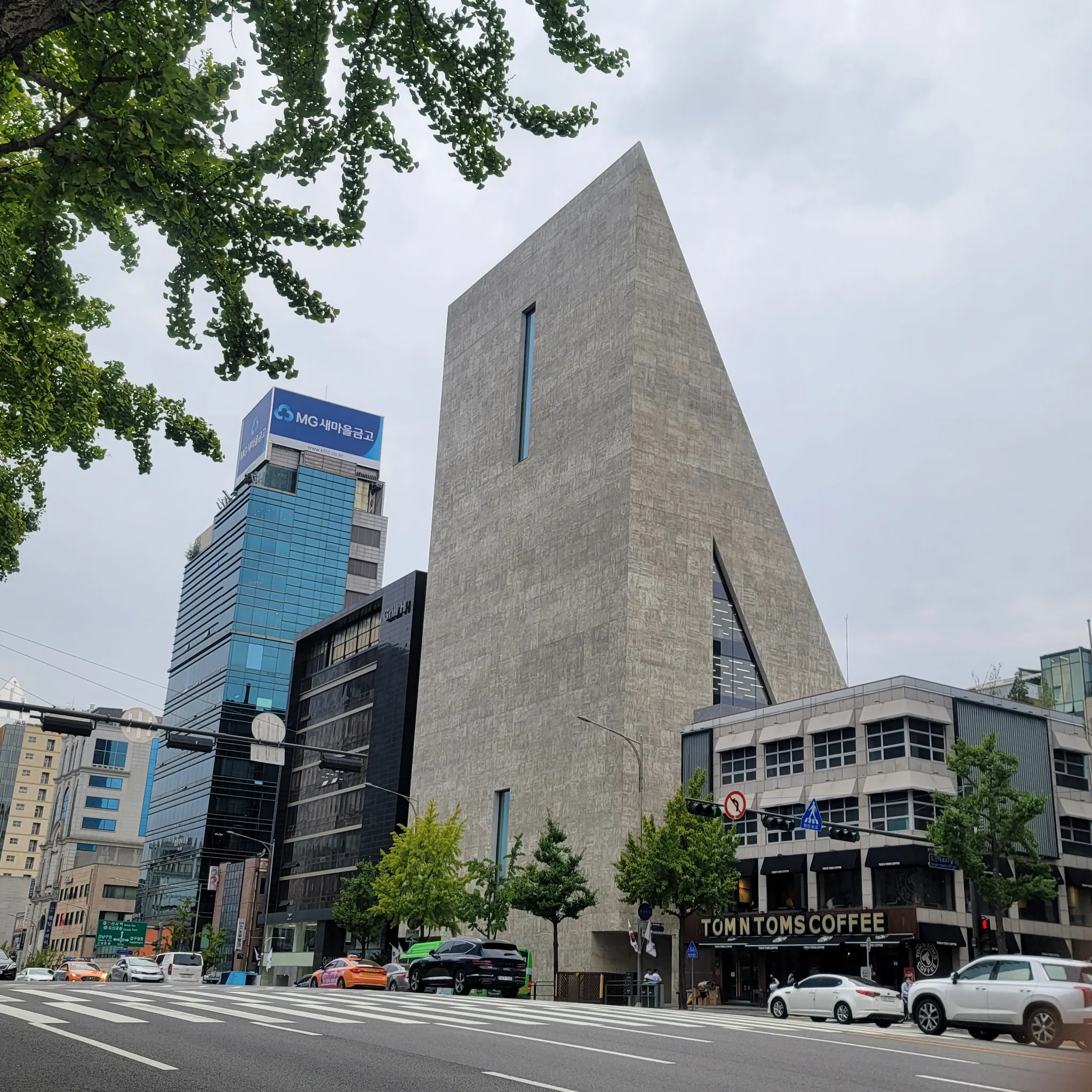 송은 미술관은 삼격형 모양의 거대한 매스(물리적인 덩어리를 의미) 로 설계되었습니다. 단순하지만 거대한 스케일의 건축물은 도시 경관에서 하나의 오브제처럼 느껴지게 되어 도시의 랜드마크로 작용할 수 있습니다.